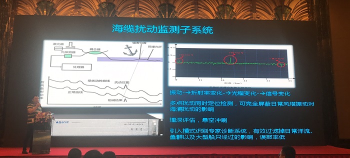 作為海纜監測領(lǐng)域的領(lǐng)軍企業(yè),蘇州光格受邀作了演講。光格研發(fā)副總監、中國科學(xué)院大學(xué)博士王宏飛以《海纜運維監控技術(shù)應用與展望》為題,就海纜運維面臨的風(fēng)險和光格的解決方案做了系統介紹。王博士提到,光格也是一家從核心設備到軟件平臺均為自主研發(fā)的海纜監測方案供應商,核心設備--光纖傳感產(chǎn)品性能達到國際領(lǐng)先水平,高度自主研發(fā)使系統具備更高的性?xún)r(jià)比和更強的全壽命周期管理能力。截止到2018年5月25日,光格累積對25條海纜實(shí)施綜合在線(xiàn)監測,合計長(cháng)度超過(guò)219公里,系統累積運營(yíng)時(shí)間超過(guò)75000小時(shí),業(yè)績(jì)在業(yè)內遙遙領(lǐng)先。