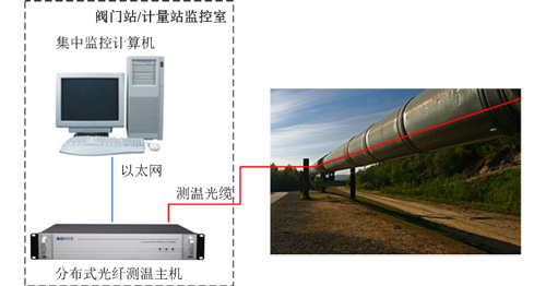 油氣管道泄漏監測系統主要由分布式光纖測溫主機及相應的測溫光纜組成,對管道的溫度進(jìn)行連續線(xiàn)型實(shí)時(shí)在線(xiàn)監測,從而監測管道泄漏情況。整套監測系統通過(guò)其測溫控制主機通訊接口或干接點(diǎn)繼電器端子與管道SCADA系統相連,并負責向其提供報警信息及運行和故障信號。
