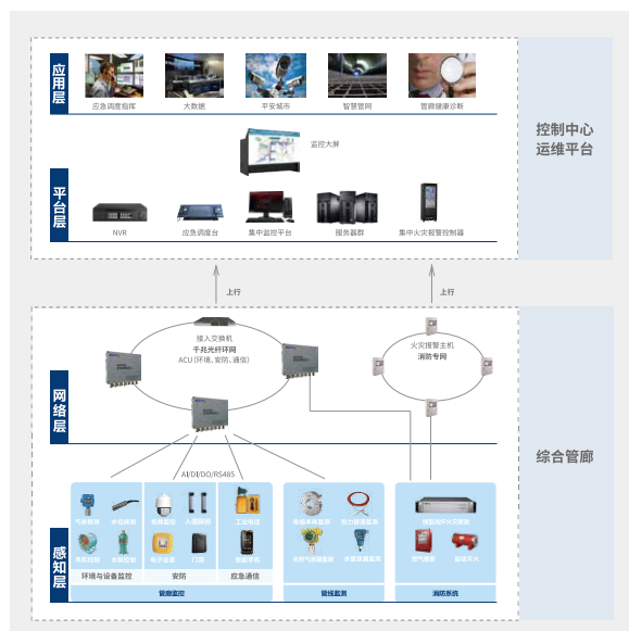 光格綜合管廊監控報警與運維管理系統由ATM8000智慧管廊運維管理平臺、區域控制單元(ACU)、管廊智能巡檢機器人以及分布式光纖感溫火災探測器(DTS)等組成。